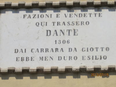 | 1222年創立され、ダンテ、ガリレオなどが 教鞭をとったパドヴァ大学。 大学の建物は地味だけれど、 中庭をぐるりと囲んだ柱廊の壁には、 有名な卒業生の名前が書いてあるのだろう か、数え切れないほどの額がかかっていた。 (これは外壁にあったもの。 ダンテの文字が見える) パドヴァ大学では 長い長い学問の歴史と精神を感じ、 鳥肌がたった。 Spiritを感じることができたような気がした。 ここを訪れることができたことは、 この旅行の一番の収穫だと思った。 |