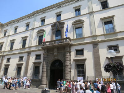 イタリアの大学を卒業(学位をとる)することは 大変名誉なことだそうで、 厳しい試験を通りぬけてめでたく学位を とった学生は、その友人、仲間、家族からの お祝いの恒例行事が待っているとか。 思い思いのコスプレのような格好をし(させられ) 紙吹雪の舞う中、「ドットーレ!ドットーレ!・・・」 と大きな歌声の中、盛大な祝福を受けます。 パドヴァ大学の前を通ると、 こういう光景にしばしば遭遇します。 (アモーレイタリアから引用) 実は私も遭遇しました。左の人垣の中心に 頭に月桂樹の冠を被り、 上半身裸?(ローマの着物を着た)の人がいて、 次々に笹の葉のようなもので、 背中を鞭打たれていて、 それを周りが「ドットーレドットーレ」と歌い はやしたてていました。 右の人垣も別のコスプレで何かやっていた。 |