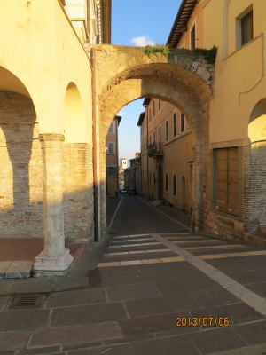 アッシジのコムーネ広場 ローマ時代の建物が教会になって 今でも残っている。 ローマ時代、ミネルバの神殿と呼ばれ 今は、サンタ・マリア・ソープラ・ミネルバ (ミネルバ神殿の上のサンタマリア教会) と呼ばれている。 |