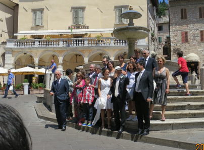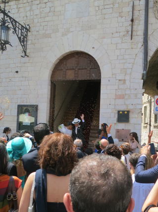 | 教会の内部は、絢爛豪華。 | 市役所の前に人だかり、市役所で式を挙げた 新郎新婦が下りてきた。 イタリアでは今もキリスト教のカトリックの 掟が厳しく、洗礼をしていない人は 教会で結婚式をあげられないとか。 また離婚も容易ではないと聞く。 |
