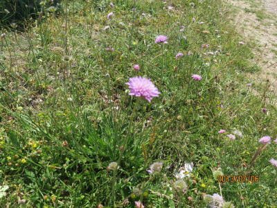 | 写真では、紫のタンポポに見えるけど 松虫草が一面に咲いていた。 |