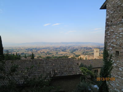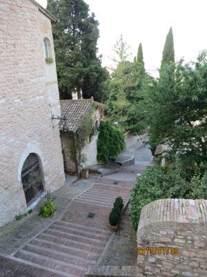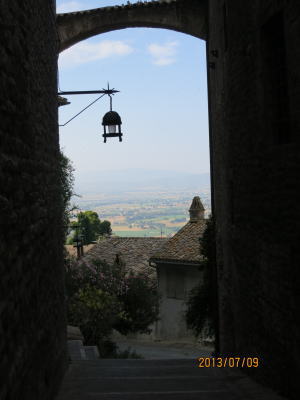 | 朝日に輝く谷、アッシジからの眺め | 石の坂道、石の家 |