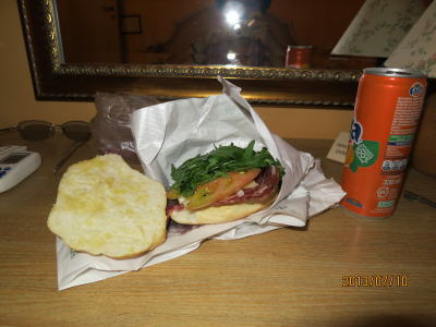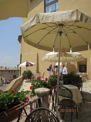 | アッシジの城壁の外から見たところ | コムーネ広場に面した食料品屋さんの 美味しい手づくりパンを再びゲット。 お持ち帰りのみで、地元の野菜、サラミ、 チーズ入り、ファンタと〆て7.5ユーロ。 |