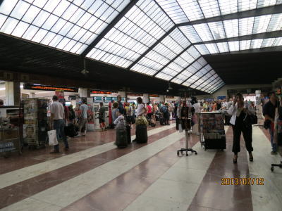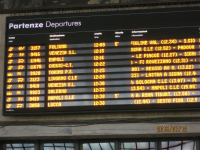| こちらフィレンツェ駅構内の様子。乗換で ベネチアまではフレッチャアルジェントという 特急に乗る。 アッシジでは電車がホームに入る直前に アナウンスで乗車ホーム変更を告げられた。 私は見送りに来てくれた奈緒美さんに 促されホームを移動。 多くの人が重いトランクと共に 一斉に地下道を下りて別の方ームへ 移動した。 こんなことは改善してほしい点。 |