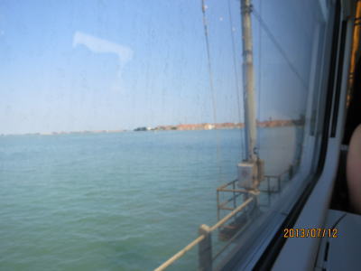 アドリア海が見えてきた。 電車はベネチアのサンタ・ルチア駅へ。 (ひとつ前のベネチア・メストレ駅で 下りないように注意) 特急電車のガラス窓が汚いので、感激も半減。 日本のようにきれいだったらいいのに と思う。 |