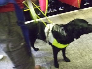 ロンドンのパディントン駅(ターミナル)で盲導犬とともに電車で旅してきた人が降りた。 やっと探し当てた、地下鉄の乗り場は奥の