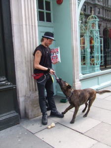 一日乗り降り自由のバス券でトラファルガー広場へ 犬と戯れる人