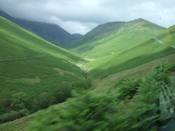 映画にヒルトップとして使われた農場(上右端)をカメラに収め、さらに車は進む。 うねうねとづづく、山並み(しかし