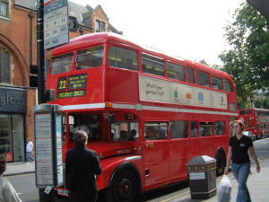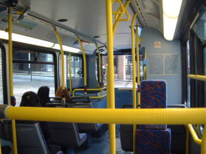 ロンドンの市バスの中 このバスは新しいもの。 ダブルデッカーの赤いバスは、窓の上に張られた、 ワイヤーをチンと鳴らして降りる合図をする。 |