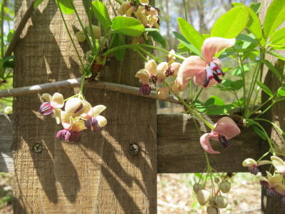 家の柵に絡ませたゴヨウアケビに花が咲きました。