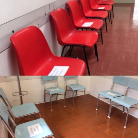 密を避ける為に、一つ置きに座席に使用禁止の紙が貼ってありました