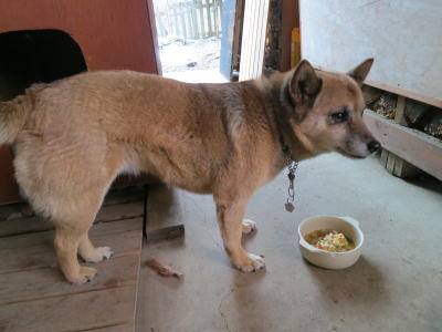 | チャーは11歳半→ まだ元気いっぱいですが、くろちゃんに合わせて 散歩の距離もずいぶん短くなりました。 ご飯は肉、野菜、ごはんが1/3づつよく煮てあります。 くろとチャーは自分の体重に合わせて 量を少し調節して分けてもらいます。 (2016年2月7日撮影) |